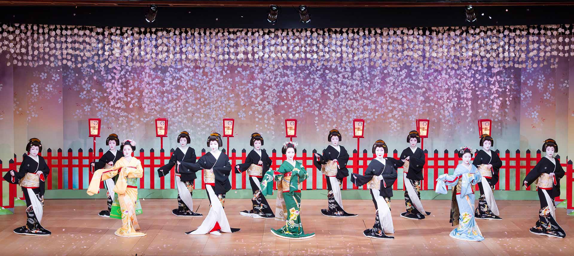 黒裾引姿に揃えた芸妓と色とりどりの鮮やかな衣裳の舞妓が
